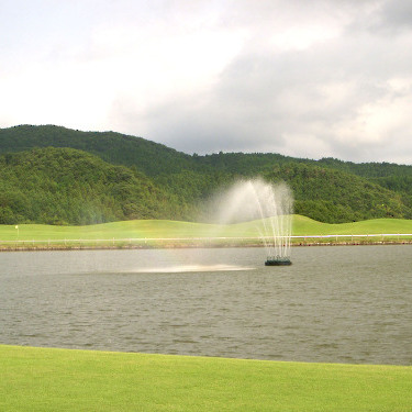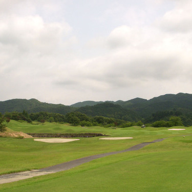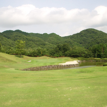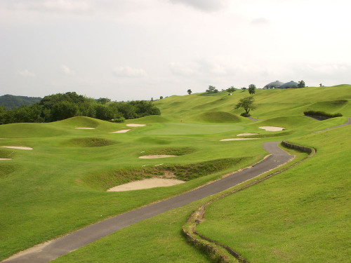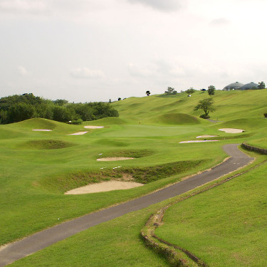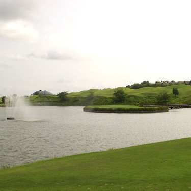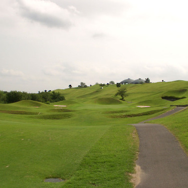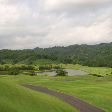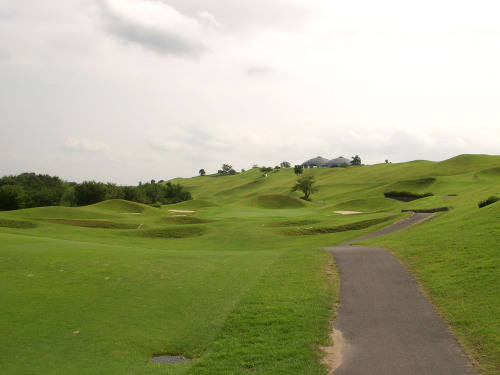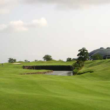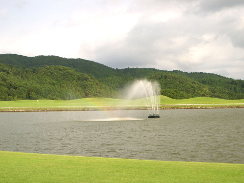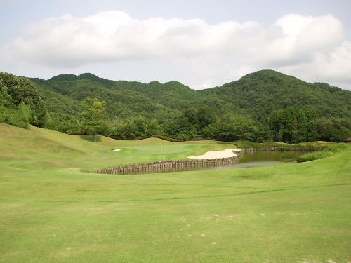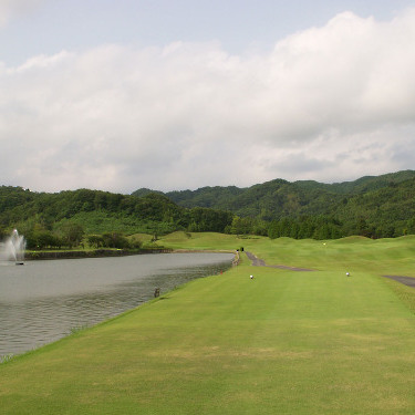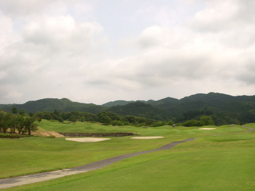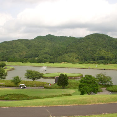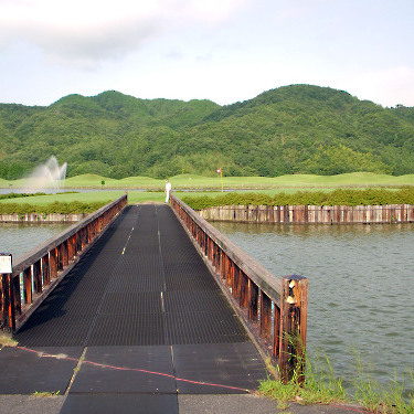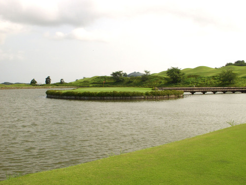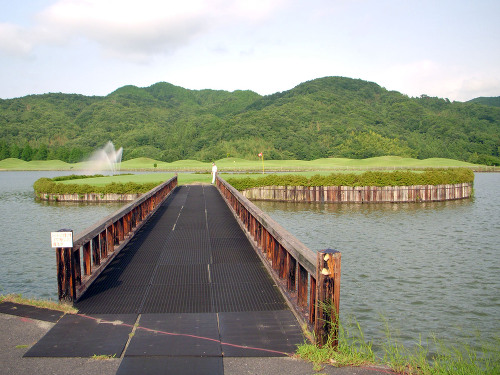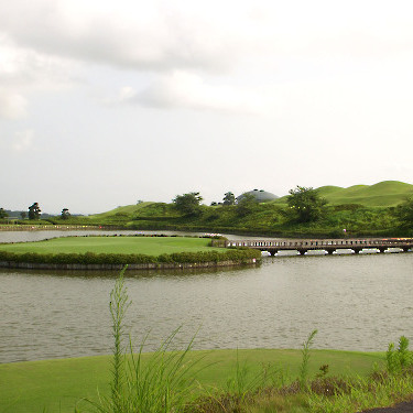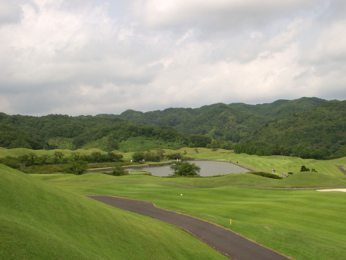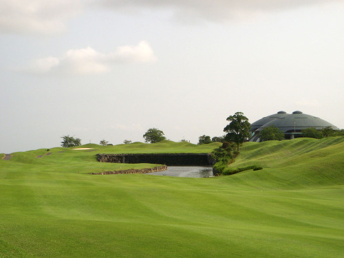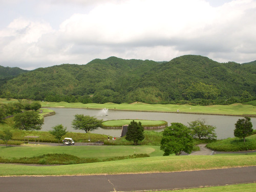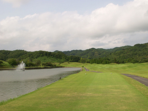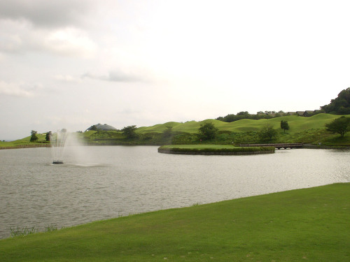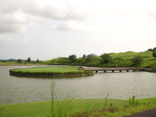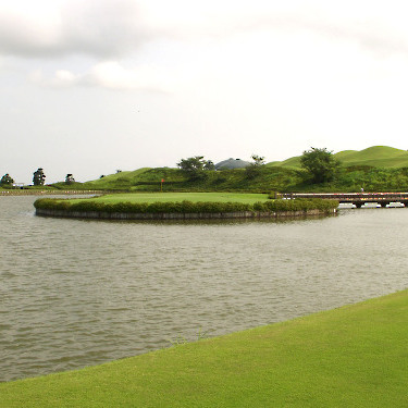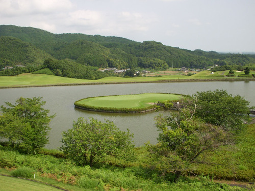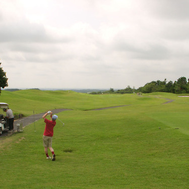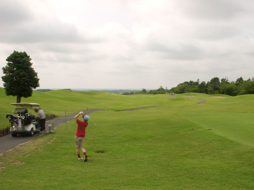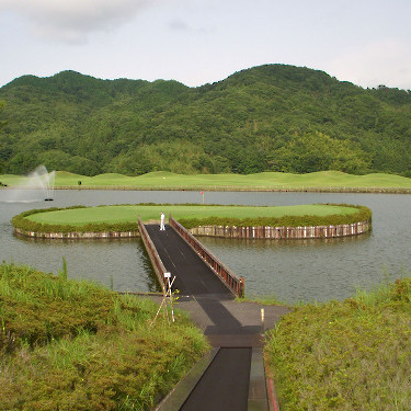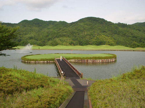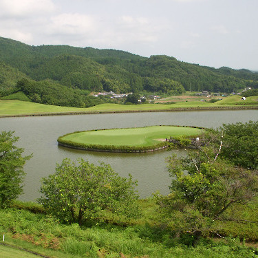 強い陽射しの中ピートらしい新・西山荘カントリー倶楽部でプレー。17番にアイランドグリーン。